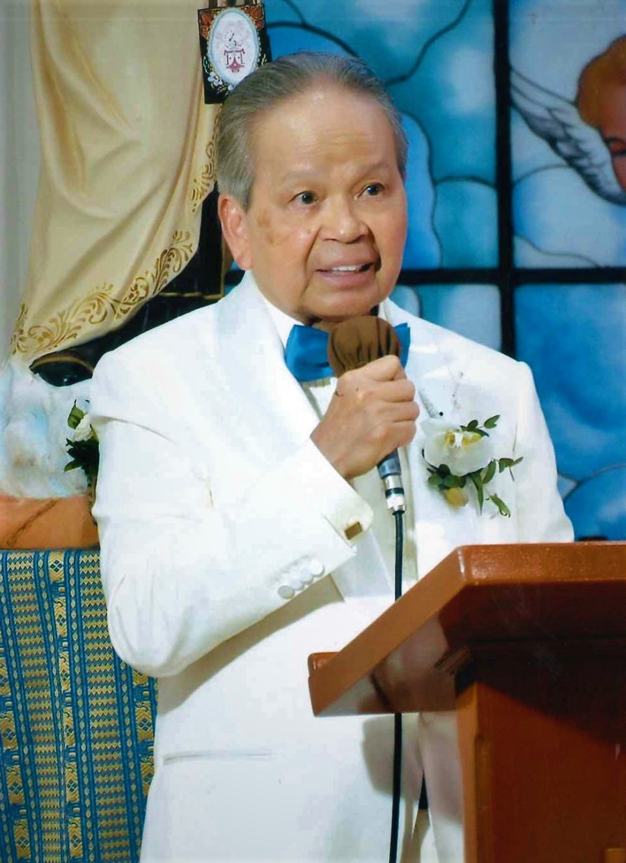 Clad in an all-white suit with a blue butterfly necktie, CJ Art Panganiban thanks Cardinal Jose Advincula, Archbishop Soc Villegas, Bishop Ambo David and Carmelite Sister Marigold Magbanua at the conclusion of the Diamond Ann